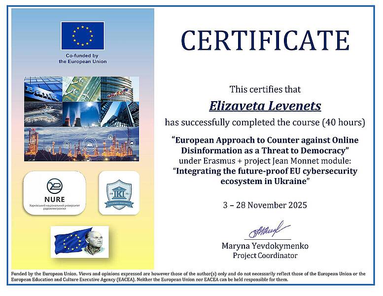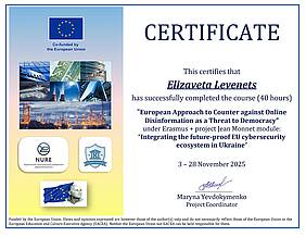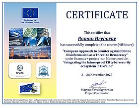 З 3 по 28 жовтня 2025 року студенти груп МЛ-11-25, МЛ-31-23 за спеціальністю В11.10 Філологія (Прикладна лінгвістика) (035.10 Філологія (Прикладна лінгвістика)) долучились до курсу "European Approach to Counter against Online Disinformation as a Threat to Democracy" under Erasmus + project Jean Monnet module: "Integrating the future-proof EU cybersecurity ecosystem in Ukraine" та успішно його завершили.