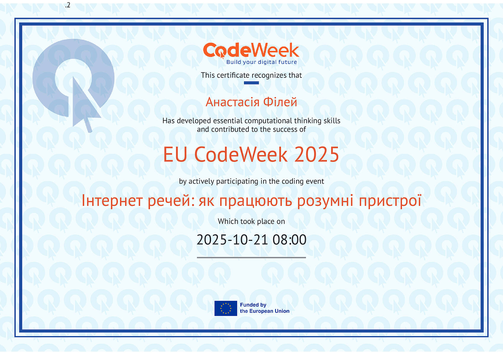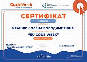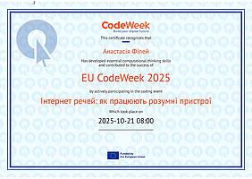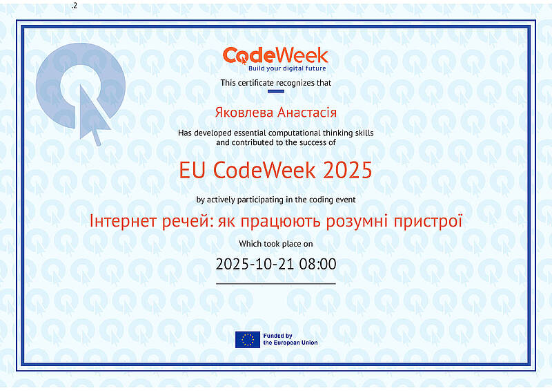 Участь у EU Code Week 2025 сприяла потужному розвитку алгоритмічного мислення та цифрової грамотності наших студентів, готуючи їх до сучасного технологічного середовища. Найбільш активні студенти групи МАК-11-25 Яковлева Анастасія, Філей Анастасія, Малишкін Кирил отримали сертифікати учасників.