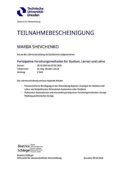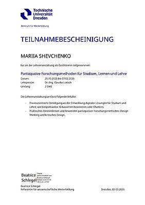 Доцентка кафедри автоматизації та комп’ютерно-інтегрованих технологій, доктор технічних наук Шевченко М.В. успішно завершила міжнародне підвищення кваліфікації та отримала сертифікат від Technische Universität Dresden (Німеччина).