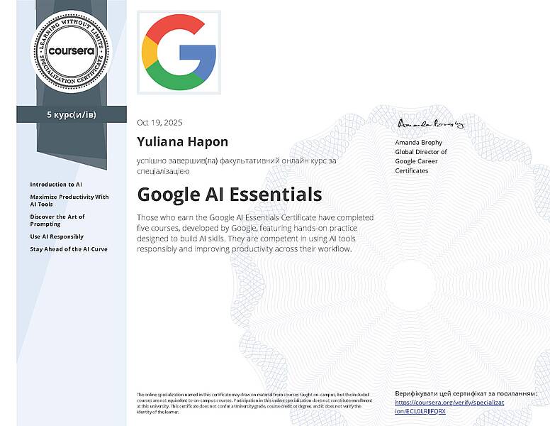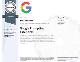 Доцент кафедри хімії та хімічної технології дорожньо-будівельного факультету Гапон Юліана Костянтинівна успішно пройшла навчання за програмами “AI Essentials” та “Prompting Essentials”, розробленими компанією Google та розміщеними на платформі Coursera.