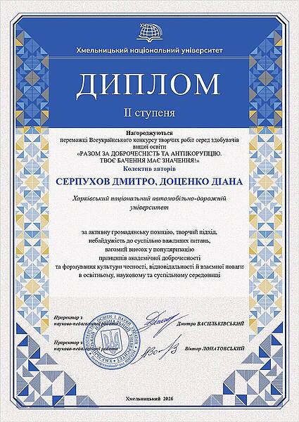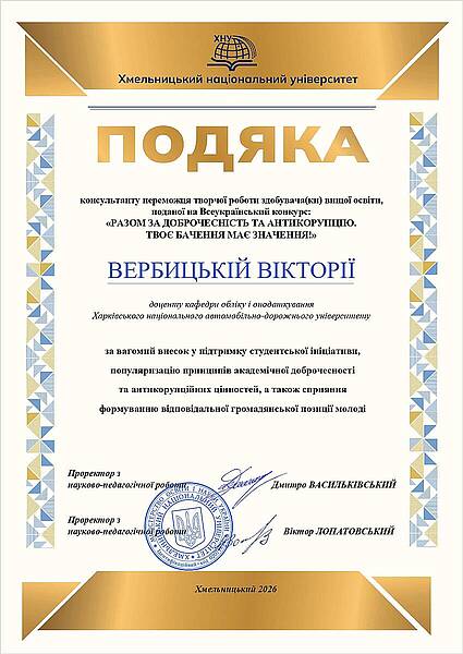 2 квітня 2026 року відбулася підсумкова конференція Всеукраїнського конкурсу творчих робіт «РАЗОМ ЗА ДОБРОЧЕСНІСТЬ ТА АНТИКОРУПЦІЮ. ТВОЄ БАЧЕННЯ МАЄ ЗНАЧЕННЯ!», який проходив на базі Хмельницького національного університету. Захід став платформою для висловлення молоддю власного бачення сьогодення та майбутнього України, обговорення шляхів подолання корупційних викликів та інших форм зловживань, а також для обміну ідеями, розвитку креативності та розширення творчого кругозору.