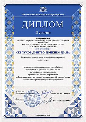 Здобувачі вищої освіти нашого університету спеціальності "Облік і оподаткування" Нємченко Віолета, тема роботи: Цифрова ідентичність особистості: між реальністю та віртуальним світом (керівник доцент Хорошилова Ірина Олександрівна),  Рождественський Олександр, тема роботи: Право проти корупції: європейський вектор розвитку України (керівник Перунова Олена Миколаївна), Серпухов Дмитро та Доценко Діана, назва роботи "Момент вибору" (керівник Вербицька Вікторія Іванівна) взяли активну участь у конкурсі, представивши роботи в усіх номінаціях.  Представлені роботи вирізнялися актуальністю, змістовністю та прагненням учасників не лише окреслити проблеми, а й запропонувати шляхи їх вирішення.