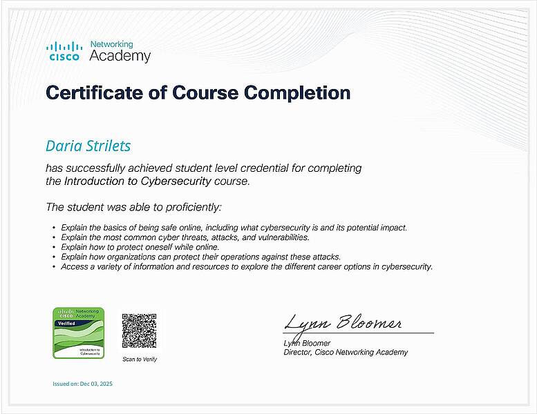 3 грудня 2025 року скарбничка досягнень здобувачів освіти кафедри кібербезпеки поповнилася важливою відзнакою. Студентка 1-го курсу Дар'я Стрілець успішно завершила навчання та отримала сертифікат курсу «Introduction to Cybersecurity» від академії Cisco Networking Academy.