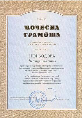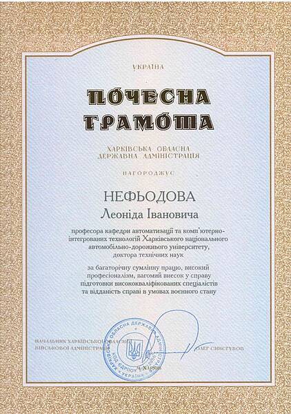Вітаємо професора Нефьодова Леоніда Івановича з отриманням почесної грамоти Харківської областної державної адміністрації