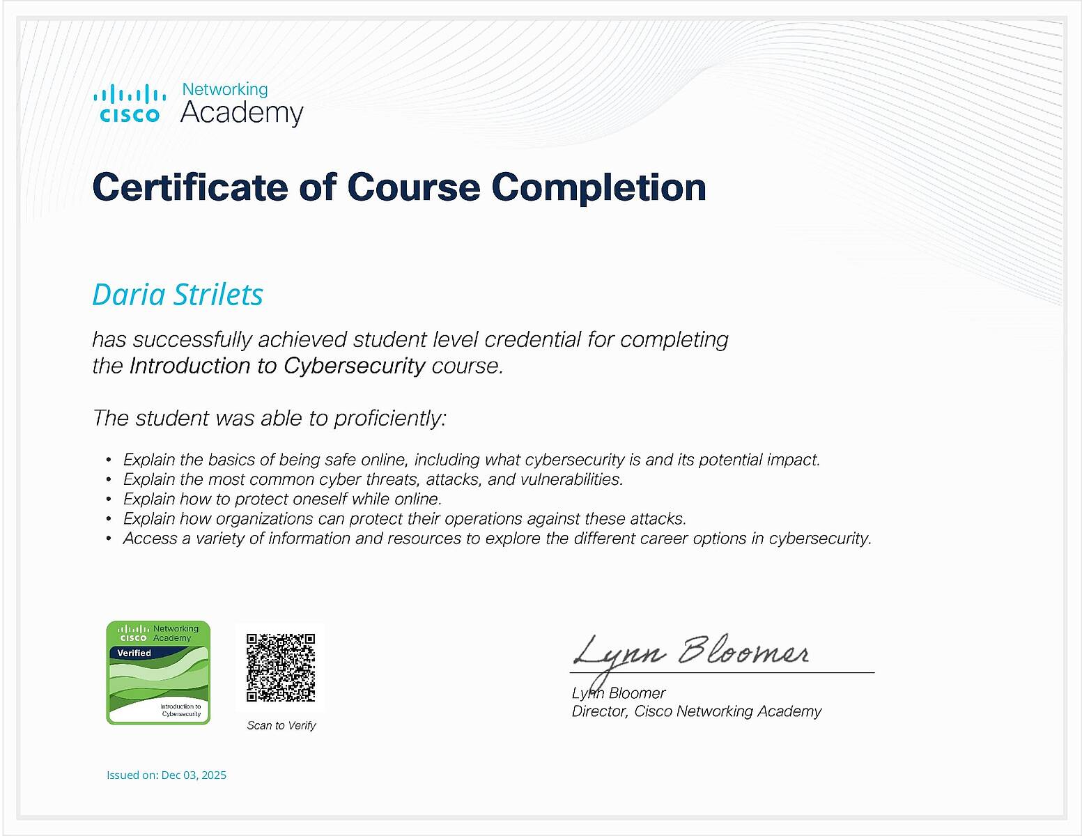 3 грудня 2025 року скарбничка досягнень здобувачів освіти кафедри кібербезпеки поповнилася важливою відзнакою. Студентка 1-го курсу Дар'я Стрілець успішно завершила навчання та отримала сертифікат курсу «Introduction to Cybersecurity» від академії Cisco Networking Academy.